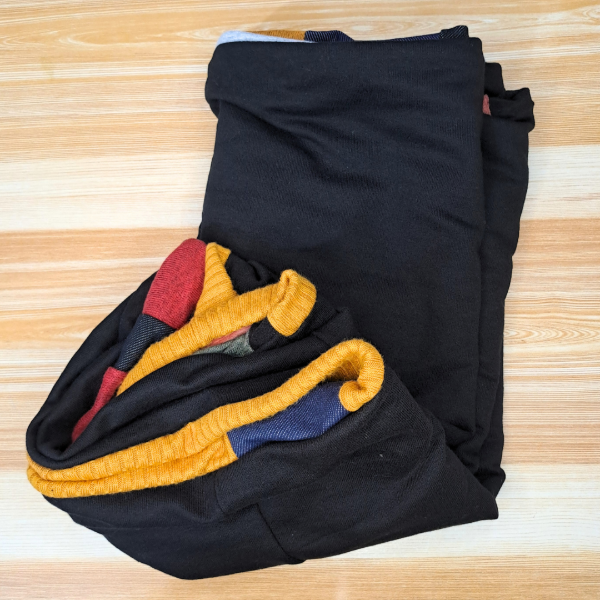Confeccionado en plush acanalado de un lado y en distintos géneros del otro (lanilla, rústico de algodón, lycra símil jean, modal, morley y jersey).