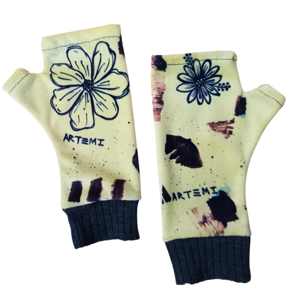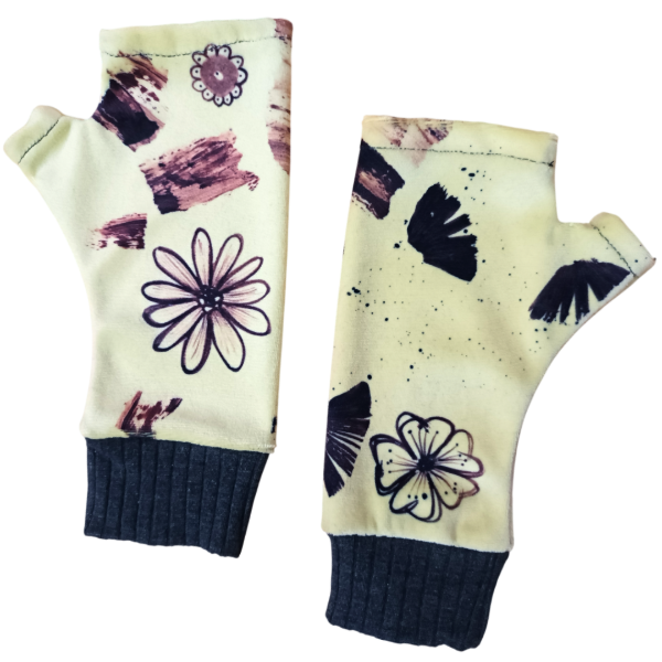 Mitones de plush con puño de algodón y estampas pintadas a mano y luego transferidas a la tela.