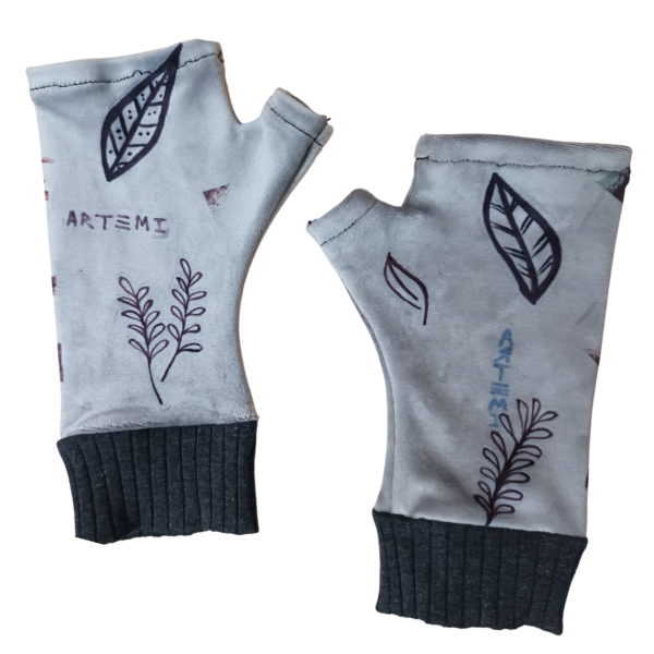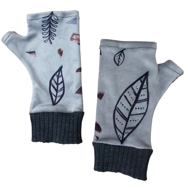 Mitones de plush con puño de algodón y estampas pintadas a mano y luego transferidas a la tela.