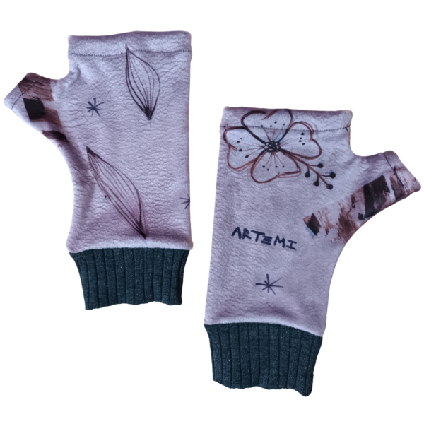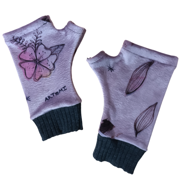 Mitones de plush con puño de algodón y estampas pintadas a mano y luego transferidas a la tela.