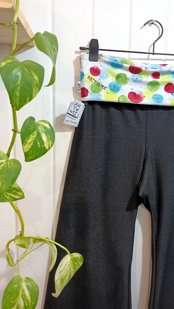 La cintura es doble y ancha, para doblar y regular la altura del tiro a gusto (no lleva elástico ).