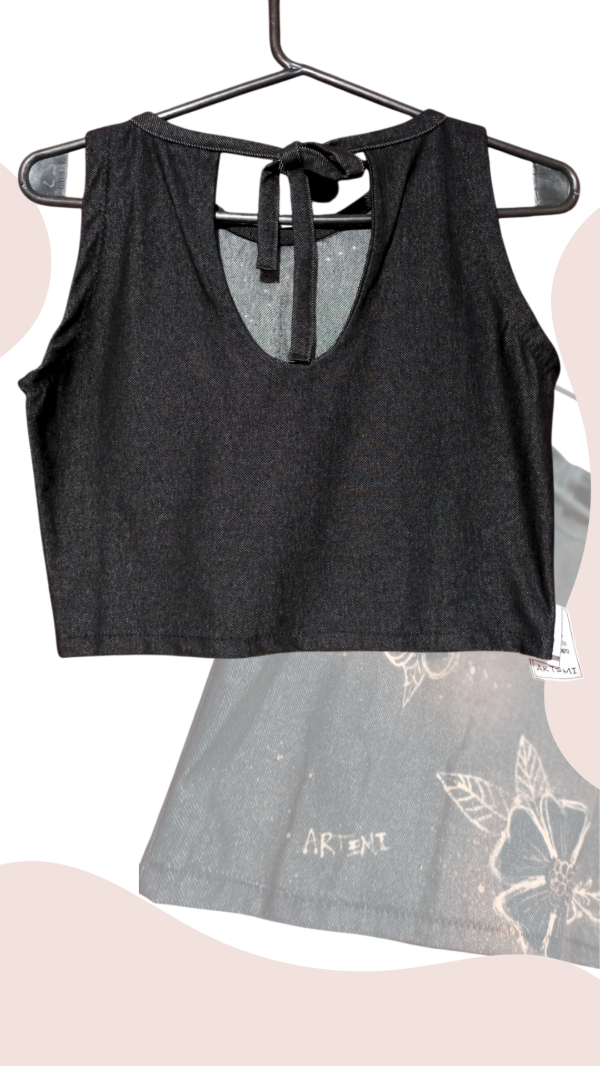 Top corte halter confeccionado en lycra de algodón símil jean negro.