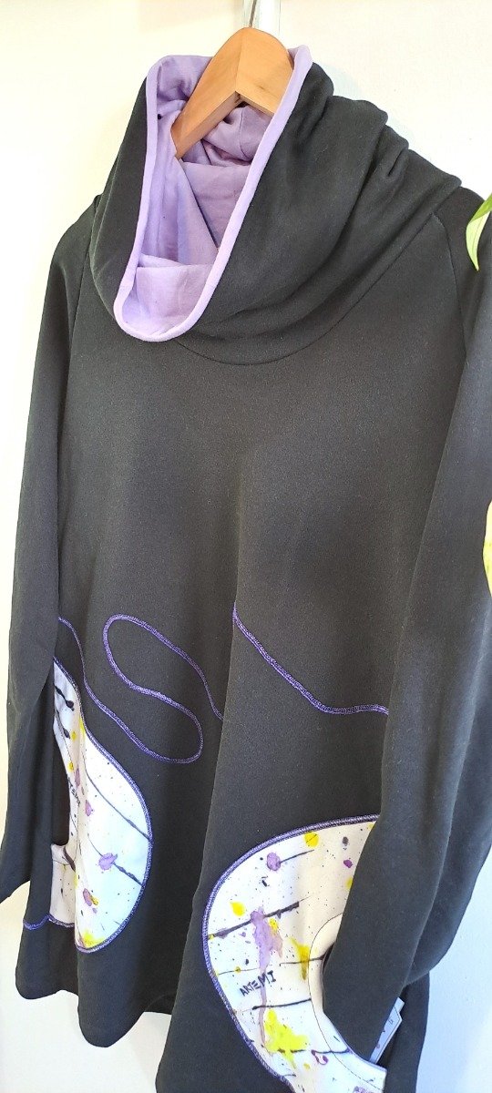 Corte manga ranglan con cuello volcado, todo forrado. Con detalles de costuras decorativas y bolsillos con estampas pintadas a mano.
